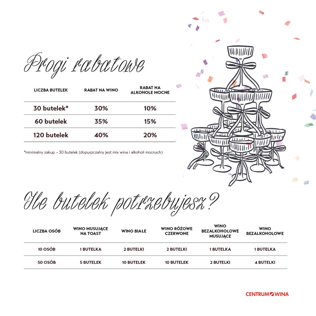 Pakiet zawiera praktyczny kalkulator, który pomoże Ci dokładnie oszacować zapotrzebowanie. Bez ryzyka, że zabraknie wina w połowie imprezy (albo zostaniesz z zapasem na trzy kolejne lata ).